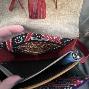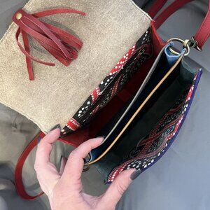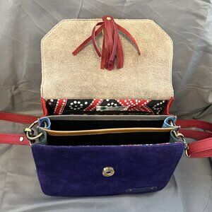This super cool bag has a vibrant purple/blue suede body with a black and white snakeskin style hair-on-hide flap, yellow tab, and maroon tassel. It has gorgeous maroon black and blue suede gussets, and long adjustable maroon leather strap for crossbody wear.