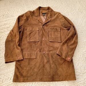 This is a great looking pre-owned Men's soft suede leather jacket. This jacket is in excellent condition and has been well cared for. The jacket is a size XL.