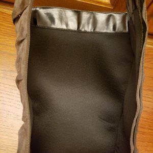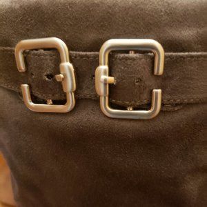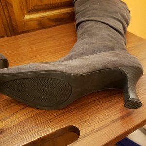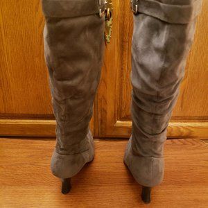These fabric suede look boots are 13 and1/2 in from top to bottom, 15 and 1/2 around the calf and a 2in heel. Gently used in good condition.