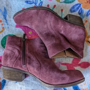 Gently used suede Lucky Brand Booties. Side zipper for easy slip on/off. Beautiful wine color/burgundy. Very comfortable, cute subtle western look. Can be worn with dresses, shorts, pants. Leather upper. Man made sole. Fabric lining.