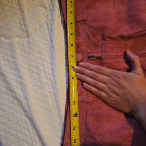 Never worn! No stains. The small dark variations visible in the suede (Photo 4/5) are a natural feature of genuine goat leather and add to its unique character. The waist is approximately 15" lying flat (Photo 5/5), and it is 31" long (top of waistband to bottom edge hem).
