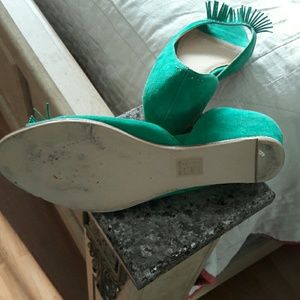 Teal colored with small silver studs on the back and front of shoes with a cool fringe on front top of shoe. Never worn just tried on. True to size.