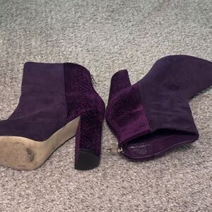 Lightly worn, pointed toe ankle boots with block heel. Velvety material on the back has a 3D snakeskin pattern.