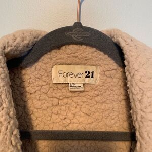 Faux Suede vest with soft fur lining. Has leather and plastic clasps in the front but looks cute left open paired to with jeans and a long sleeve T. Suede is a gray blue color and the fuzzy lining is a cream/tan. Has some stains on the front fur. Hand wash only.