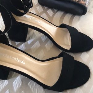 Black suede ankle strap open toe block hells offers considerd