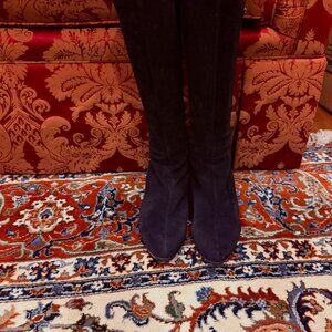 These knee-high velvet-like (suede) high-heeled boots are perfect for the fall and upcoming holiday season. Two decorative buttons adorn the side of the boots near to the top. They zip up and fit like a glove, meaning no sagging. Worn only a few times and realized I should have gotten another size.