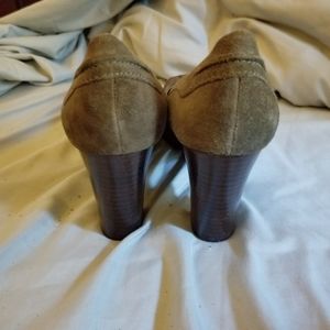 Gorgeous dark tan suede professional heels with a brown leather strap across the toe accented with an antique bronze buckle and two bronze studs, and a beautiful wooden 4" chunky heel.