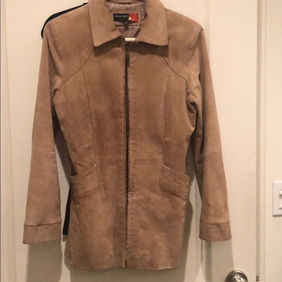 Beautiful Tan color Suede jacket with minor flaws. I Just tested the zipper, it may need to be replaced, minor light stains on the sleeves, misplaced the waist tie to the jacket.