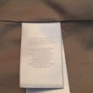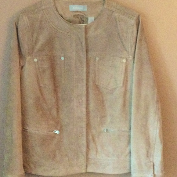 Fully lined suede jacket with zipper pockets and snap front.