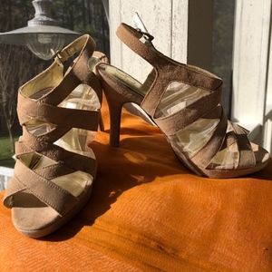 Never worn. Casual tan suede sandals. 6.5" size shoes. Great with jeans!!