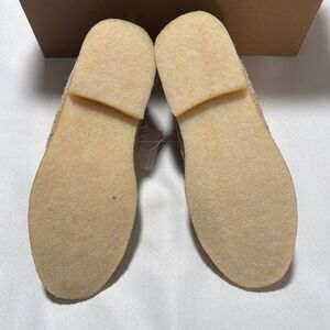 These are brand new in box. Medium width. The color is light tan. These are genuine suede and look sherpa.