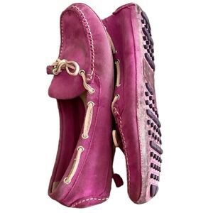 Comfy pink suede driving shoes. There is soiling on the left & right bottom of shoes. You know that time when you have beautiful shoes on but you’re afraid they’ll get scuffed up while driving? The back is hard rubber so slip these on and your good shoes are protected. They will protect your other shoes. Keep ‘em’ in your car and save all your other shoes. 9.5
