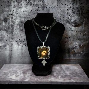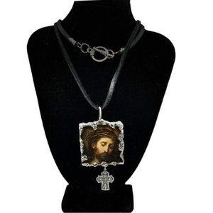 This tiny canvas is a cutout of an art book, it is decoupaged, then encased in glass and framed with soft soldering. The painting is Ecce Homo, also known as Suffering Christ, painted by Bartolomé Esteban Murillo, 1645-46 in his native Seville. I added a vintage Sterling Silver 925, 4 Way Medal Pendant Charm Necklace Religious Four , lava rock beads, wrapped with sterling silver, and on the other side I used black amethyst beads, and fragments of a vintage necklace.