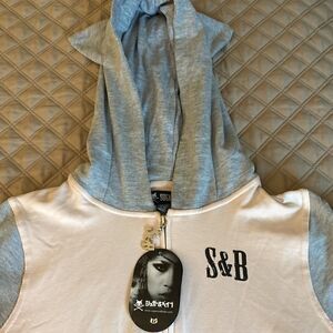 Sugar & Babe woman’s or girls cropped cat hoodie. Front silver tone zipper with logo pull, heat sealed cat face on back, hood with cat ears, logo on left front chest, secure knit ribbing around waist & cuffs.