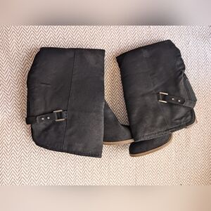 Stylish black over the knee boots. Features a sturdy tan heel. Perfect for versatile wear.