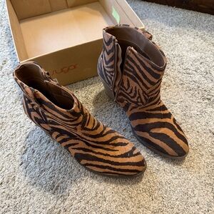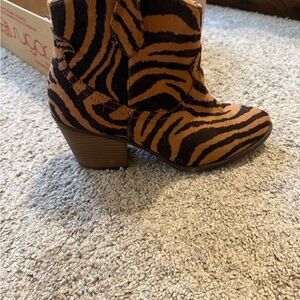 Elevate your footwear collection with these Sugar ankle booties, featuring a striking zebra print in rich brown tones. Crafted for both style and comfort, these booties are perfect for adding a touch of wild elegance to any ensemble. Ideal for casual outings or making a statement on a night out.
