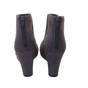 Step up your style with these chic Sugar Juliette wedge booties. Crafted in soft gray faux suede, these ankle boots feature a trendy chevron side detail, comfortable wedge heel, and an easy back zipper closure. Perfect for pairing with jeans, skirts, or dresses for a polished yet casual look.