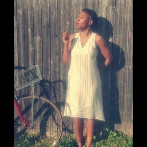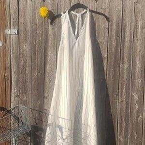 Pinstriped halter dress by Sugar + L!ps. Stops about mid-calf. Open back. Length of dress: 49.5". Measurements of model are as follows: