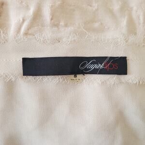 Sugar Lips sleeveless sheer top with a floral fabric pattern in the front and unfinished edges. This top is in excellent condition (no rips, no stains, or damage and comes from a smoke and pet-free environment).
