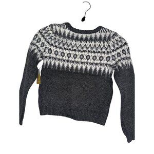 This Sugar Moon sweater for kids in size L (10-12) features a classic Fair Isle pattern in gray and white. The wool blend ensures warmth and comfort, making it ideal for colder months.