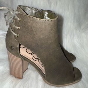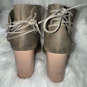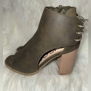 Stylish olive ankle booties with peep-toe design. Versatile and trendy for any outfit.