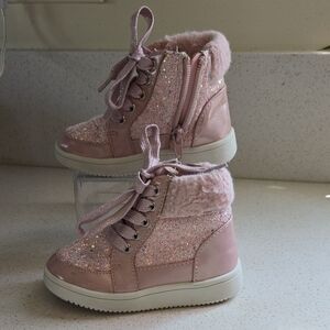 🚨see picture closely signs of used🚨Adorable pink high-top sneakers with glitter details. Features a side zipper and lace-up design. Perfect for adding sparkle to any outfit.