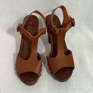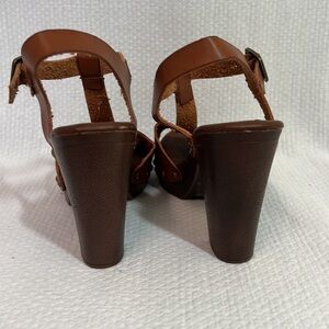 Sugar Quele Brown Vegan Leather Brass Studded Block Faux Wood Heeled Sandals 6.5