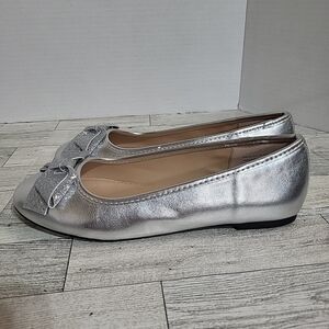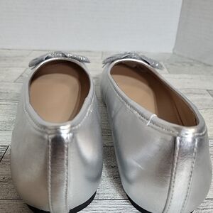 Step out in style with these elegant silver flats featuring a sparkling glitter bow. Perfect for any occasion, these shoes offer both comfort and chic design.