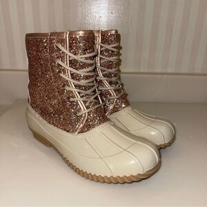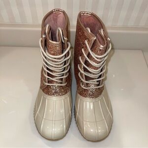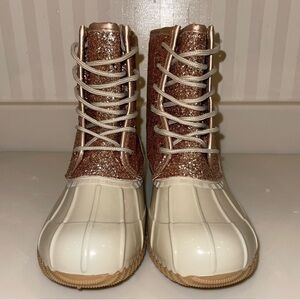 Sugar “Skipper” Rose Gold Glitter Lace Up Rain Snow Duck Boots