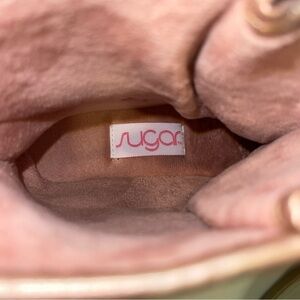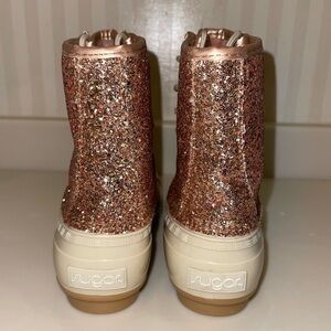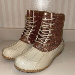 Sugar “Skipper” lace up rose gold glitter rain snow duck boots. Round toe, cushioned insole, total height 7 1/2”. Cream rubber upper with sparkling rose gold glitter shaft. Soft textile lining, treaded sole. Put sparkle in your step even on a wet rainy day. Excellent like new condition. Size 7
