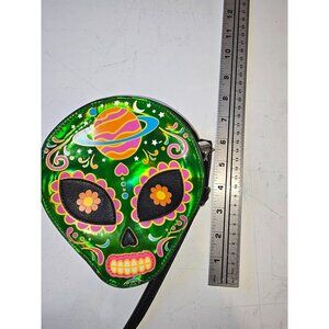 Charming crossbody bag with a vibrant sugar skull design, featuring a unique alien twist. Ideal for casual outings or themed events.