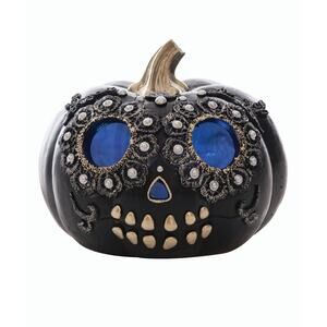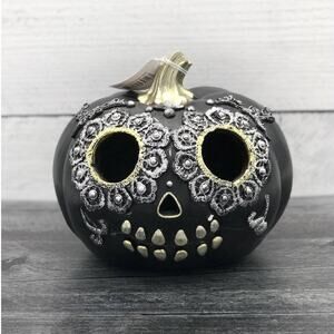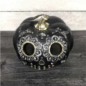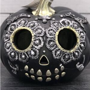 New black resin Dia De Los Muertos Sugar Skull light up pumpkin. It has silver and gold accents and color changing lights. Measures approx 6.5”h x 7.75” in diameter.