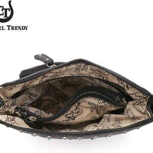 Product Dimensions: 9 X 3 X 9.5 Inches; 1.1 Pounds Department: Womens Color: Black Fabric Type: Pu Leather Closure Type: Zipper Lining: Cotton That huge vibrant-colored Sugar Skull print is sure to be the center of attention. Bright colored sugar skulls, cross and flowers are printed all over the handbag. Made from Premium Faux Leather for durability. This purse will last for years and you'll feel good knowing that no animals were harmed in the making of this purse. Top zipper closure to keep contents secure. Comes with detachable and adjustable strap so you can carry your daily essentials in style. Can be worn 3 ways: As a messenger bag, shoulder bag or remove the strap and make it a cute purse. Double compartment interior with a center zip pouch and a zip pocket to keep you always organized. | Two pockets on the back provide quick access to your phone or conceal carry item and doubles as a smart phone pocket. Crossbody Handbags: Length 9'' Height 9.5'' Width 3'' Western Cowgirl Classic Shoulder Bag With Wallet Set [Interior: Top Zipper Closure, Interior Middle Zipper, Divider Pocket with Multiple Interior Size Pockets and Flap Magnetic Closure. Exterior: Back Slot with Zipper Concealed Carry Pocket