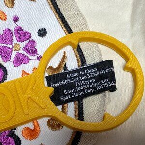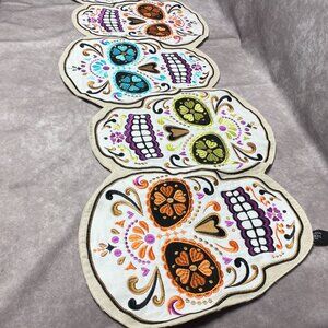 Brightly embroidered sugar skull table runner elevates seasonal or festive decor. Made with a cotton-poly blend, it's durable and visually striking.