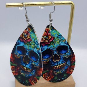 Sugar Skull Faux Leather Earrings Blue Pop Art Dangle Teardrop Gothic Jewelry