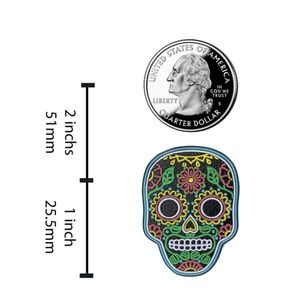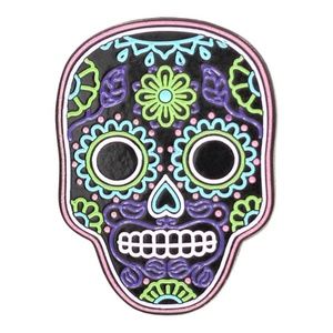 Our interpretation of the classic Sugar Skull, part of the Día de Muertos (Day of the Dead) celebration of Mexico. This premium enamel pin features Pantone dyed black metal and glowing enamel.