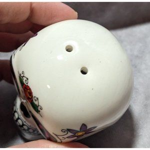 Fun and floral sugar skull salt/pepper shaker. It's a skull made of white ceramic, and has traditional sugar skull/ Dia de los Muertos designs on it. It has two hole on the top for shaking out whatever spice or seasoning you wish to fill it with, and has a plastic stopper on the bottom for easy filling.