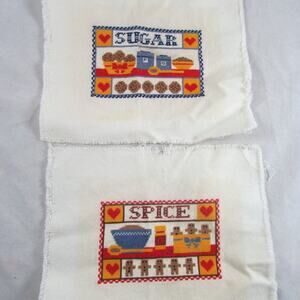Two completed, unframed sugar & spice kitchen themed counted cross-stitch wall hangings.