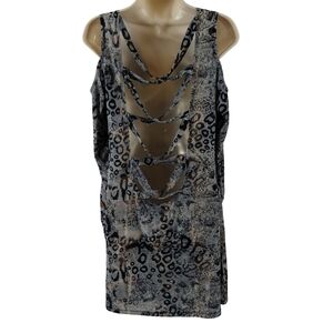 Stylish leopard print dress with cold shoulder design. Features a deep cowl neckline
