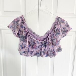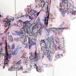 This crop top features a structured bust, ruffle construction, and floral dragon print all over.