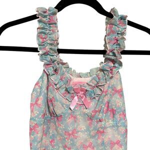 Stylish dress with a playful bow pattern. Features a ruffled hem and delicate straps. Perfect for a fun day out.