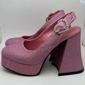 Sugar Thrillz Paradise Heart Pink Glitter Platform Heels with Heart clasp Size 7