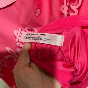 New with tags Sugar Thrillz “Plastic” Barbiecore pink dress. Features an allover logo print, sleeveless fit & flare silhouette, scoop neckline with back bow tie, and full lining.