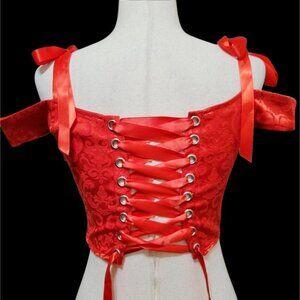 Keywords & Tags: scarlet corset, satin floral corset, jacquard corset top, adjustable tie straps, ribbon lace‑up back, red corset top, Sugar Thrillz corset, romantic wear, evening corset, medium size corset, alt‑core glam, statement corset