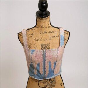 Sugar Thrillz Sequin Bustier Denim Crop Top w/ Zipper Front & Pink Sparkle – S