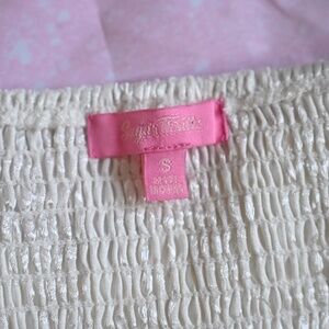 Adorable white Sugar Thrillz crop top in size S — flirty, soft, and super easy to style. Has that cute Y2K energy without being too extra. Perfect with cargos, minis, or low-rise jeans. Lightweight, stretchy, and in great shape.