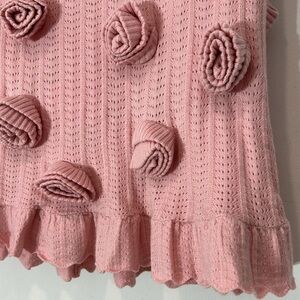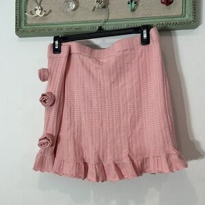 This mini skirt has a pointelle knit construction with fabric rosebud appliques on the front, a ruffled lettuce trim hem, and an elastic waistband.