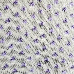 Sugar Tops sweater cream/purple knit cottage corps/coastal grandma. purple lace collar. cream ribbed knit with purple dots. ribbed cuffs and hem. keyhole loop button back closure. pretty, fun, vintage cottage corps sweater.