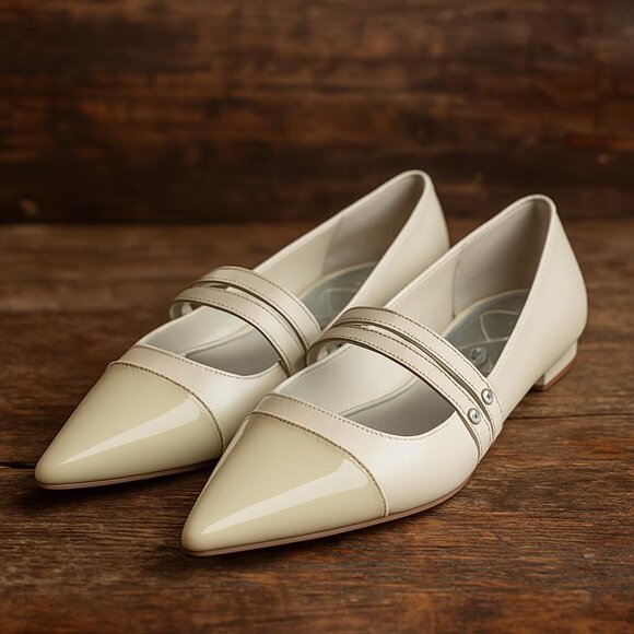 Elegant cream-colored flats with a pointed toe and satin-like sheen. Double strap detail across the top with pearl-style accents adds a classy touch. These shoes are versatile enough for work, weddings, or casual dressy outfits.