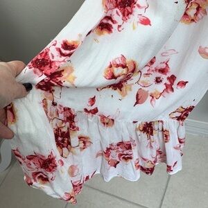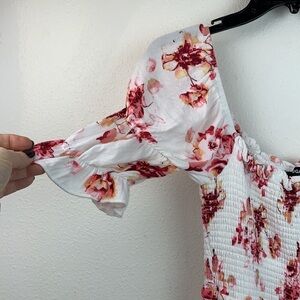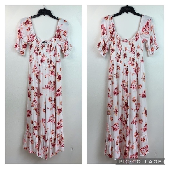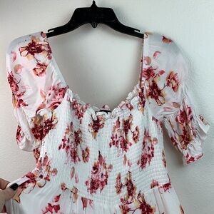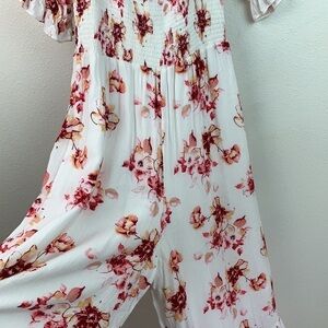 Sugar lips: gauzy smoked bodice jumpsuit with puffed sleeves, square neck and wide cropped legs with a deep ruffle on the hems. Pants are fully lined!